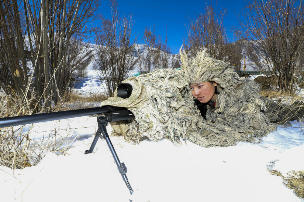 達(dá)娃卓嘎在雪地中潛伏狙擊。楊勇 攝