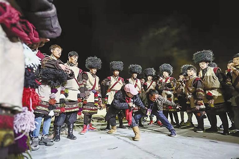 燈光放亮,音樂響起,史詩劇隨著夜色拉開了帷幕,雨中的百人鍋莊在敞亮的舞臺(tái)激蕩起千層水光,篝火升騰,染紅了半壁寶瓶山,齊整的“打阿嘎”的遁地之聲伴著夜雨更加氣勢(shì)如虹,泥水淹過了腳踝,沿著舞蹈動(dòng)作的弧度在演員們的腳尖、衣袖間甩落出一條條數(shù)米長(zhǎng)的水痕線,面對(duì)匍匐、跪拜、奔跑、磕長(zhǎng)頭,甚至撲地打滾等舞蹈動(dòng)作,他們沒有一絲遲疑,衣帽已與泥水混為一體,雨夜中,同進(jìn)退,共歌舞。