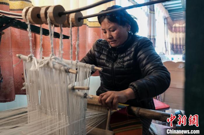 在他們家,記者看到了幾臺傳統(tǒng)藏式織機,玉珍說,這是用于織邦典(藏式毛織圍裙)的工具。2016年開始,玉珍運用編織技藝帶領(lǐng)村里的婦女共同成立了一個小規(guī)模的編織廠,“我們的羊毛線是自己染的,織出來的邦典質(zhì)感更好,也不愁銷路,為家里增收不少?!彼f,編織讓大家實現(xiàn)了家門口就業(yè),也不耽誤家務(wù),村里人很樂于接受。