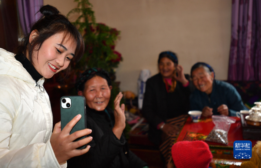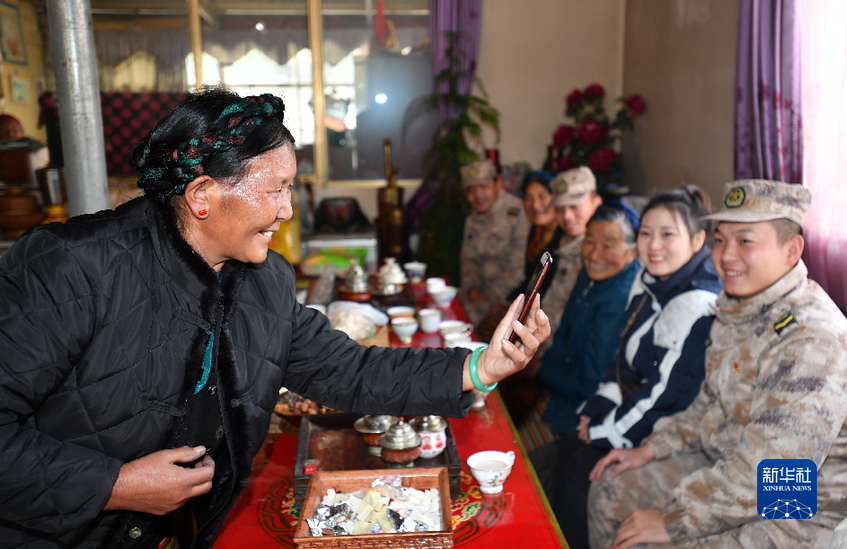 云南省楚雄彝族自治州的軍屬普曉虹寒假期間跟隨官兵到三位老阿媽家里走訪,她在和云南老家父母視頻通話時說:“爸媽,我在西藏有了三個阿媽!”(1月26日攝)。新華社記者 覺果 攝