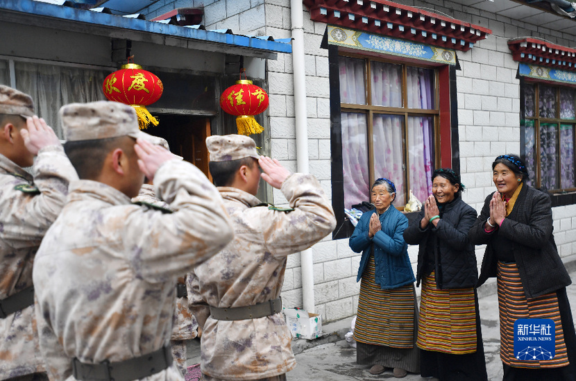 這是官兵們向三位老阿媽敬禮,老阿媽感謝解放軍(1月26日攝)。新華社記者 覺果 攝