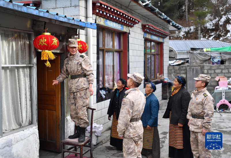 戰(zhàn)士和軍嫂們拿著鐵鍬、掃帚,為老人家鏟除積雪,貼上春聯(lián)和窗花,掛上喜慶的紅燈籠,并送來果蔬、米面和新年祝福。