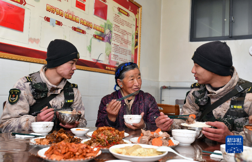 次仁曲珍老人在哨所與戰(zhàn)士一起吃飯時,講述過去送菜的經(jīng)歷(1月27日攝)。新華社記者 覺果 攝