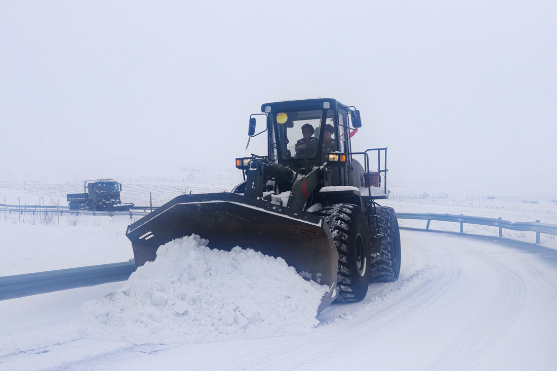 圖為武警官兵利用除雪車清理路面積雪結(jié)冰。