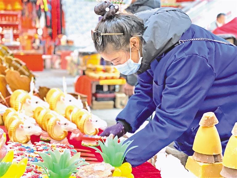 在雪域亙古浩瀚的歷史中,高原兒女自古以來便認定“羊”是吉祥的動物,代表了藏族群眾祈盼來年五谷豐登、六畜興旺。塑彩羊頭在藏語中稱為“隆果”,一般擺放在新年布置的貢品中央。“爸媽去年購買了一種用石灰制作的塑彩羊頭,今年我想購買陶瓷制作的塑彩羊頭放在爸媽家,去年買的拿回自己家,這樣既環(huán)保,也讓老人開心。”市民索朗旺堆在年貨攤位購買“隆果”時說。