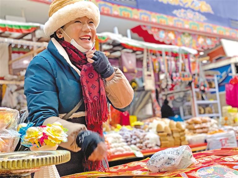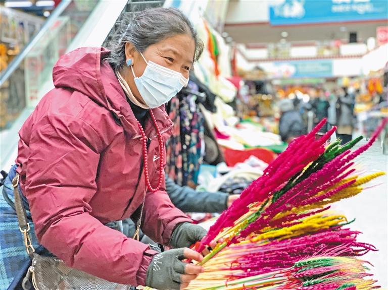 近年來,新春佳節(jié)貼“年紅”的傳統(tǒng)習俗日漸走進圣城雪域。如今,無論城市還是農村,幾乎家家戶戶都會在門上貼藏文春聯(lián),增加喜慶的節(jié)日氣氛。來自墨竹工卡縣的平措卓瑪正在八廓商城年貨攤位前整理著春聯(lián),去年已經(jīng)擺過一次年貨攤位的她,在1個月的時間里掙到了8000元?!敖衲陻偽怀楹灂r,心里特別緊張,怕位置不好,沒想到抽到了中間的好位置,這里采光足,紅彤彤的春聯(lián)在陽光下更好看了。新的一年,希望大家幸福安康、平安吉祥!”平措卓瑪懇切地說。