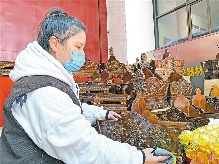 來自山南市貢嘎縣的拉吉帶著自家生產的“切瑪盒”第2次來到八廓商城年貨市場?!坝捎谑亲约疑a,所以我們自主設計了一款線條稍微簡約的‘切瑪盒’;還有一款傳統(tǒng)線條與圖案的‘切瑪盒’。在顏色上,我們選擇了較為持重的深色,這樣的顏色大氣沉穩(wěn),許多市民非常喜歡,兩款售價都是380元?!崩榻B道。