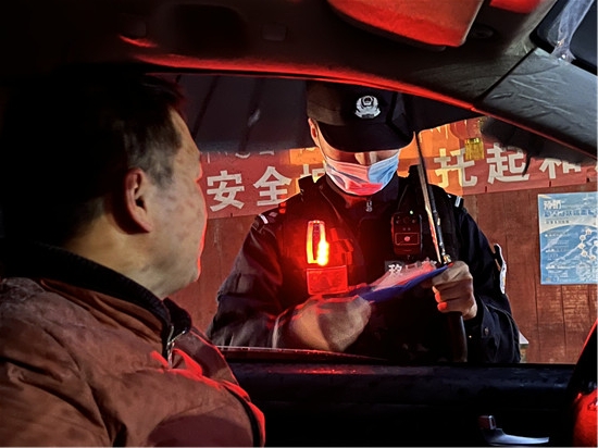 圖為林芝達(dá)國(guó)橋邊境檢查站民警元宵節(jié)當(dāng)晚在執(zhí)勤點(diǎn)檢查車輛。 姜?jiǎng)P峰 攝