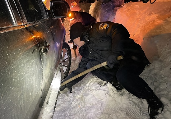 在到達(dá)現(xiàn)場(chǎng)后,救援民警立即為早已凍得瑟瑟發(fā)抖的被困人員送上了熱水和防寒大衣,并安撫了被困人員情緒。在勘察了現(xiàn)場(chǎng)的情況后,救援民警一邊用鐵鍬和雙手迅速清理車輛底盤(pán)的厚冰,一邊用牽引繩嘗試將被困車輛進(jìn)行拉出,因積雪太厚嘗試多次未能成功,隨后,協(xié)調(diào)到朗縣養(yǎng)護(hù)段一輛推土機(jī),經(jīng)過(guò)一個(gè)小時(shí)救援,被困車輛成功被拖出。被困人員救出來(lái)后,為了確保車輛人員的絕對(duì)安全,金東邊境派出所救援民警全力護(hù)送被困人員于晚上11點(diǎn)45分安全抵達(dá)單位營(yíng)區(qū),救援工作取得圓滿成功。
