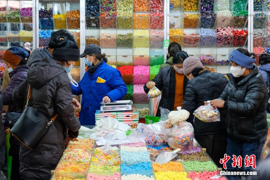 目前正值藏歷12月下旬,西藏即將迎來(lái)傳統(tǒng)藏歷水虎新年,拉薩民眾也全面進(jìn)入“藏歷新年時(shí)間”。2月27日下午,小新在西藏最大的傳統(tǒng)綜合市場(chǎng)——拉薩沖賽康市場(chǎng)周邊看到,羅薩美朵、卡塞、酥油、切瑪盒、糖果、干果、藏式服裝等年貨琳瑯滿目,購(gòu)買(mǎi)的市民也進(jìn)入“最后”的采購(gòu)時(shí)間,市場(chǎng)周?chē)巳航j(luò)繹不絕,高原迎春、年味十足。圖為一商販在拉薩沖賽康市場(chǎng)周邊銷(xiāo)售藏歷新年年貨“褪”。江飛波 攝