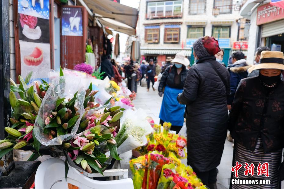 圖為拉薩沖賽康市場(chǎng)附近,銷(xiāo)售鮮花的攤販。江飛波 攝