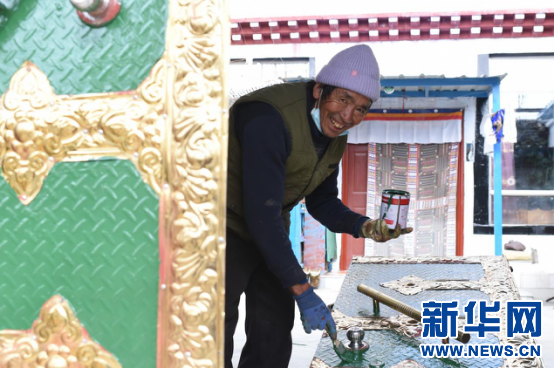 2月23日,曲水縣三有村村民旺堆在自家門(mén)上刷漆。新華網(wǎng) 旦增努布 攝