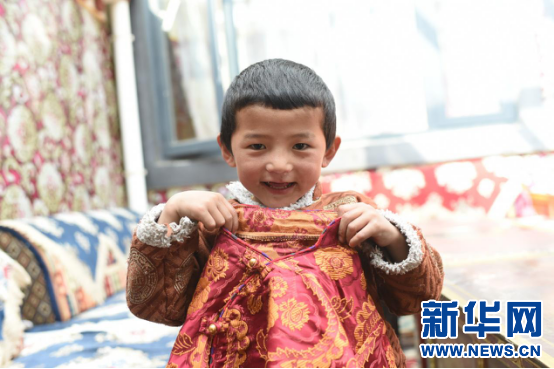 2月27日,在榮瑪鄉(xiāng)高海拔生態(tài)搬遷點(diǎn)藏曲村今年5歲的晉美塔杰展示新年的衣服。新華網(wǎng) 旦增努布 攝