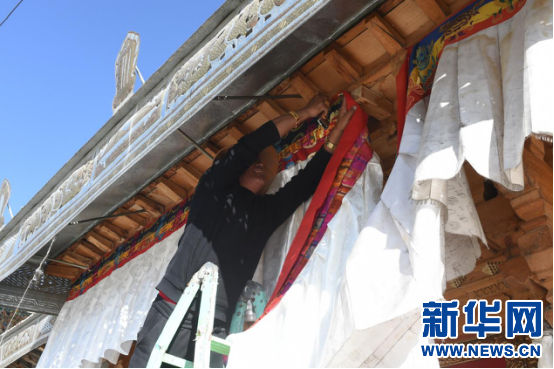 3月2日,乃東區(qū)郭沙村村民巴桑在更換大門(mén)的香布(一種藏式裝飾)。新華網(wǎng) 旦增努布 攝