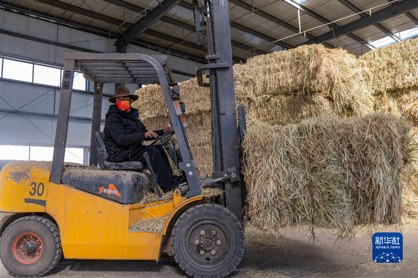 貢培在西藏娘亞牦牛養(yǎng)殖產(chǎn)業(yè)發(fā)展有限責(zé)任公司的飼草料倉(cāng)庫工作(3月30日攝)。新華社記者 周荻瀟 攝