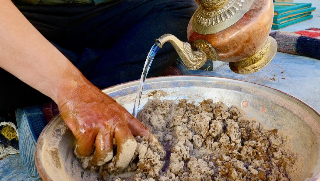 靜謐的午后,空氣里都是柏木的清香。次仁多吉盤坐在遮陽(yáng)傘下,伴著周圍清脆的流水、水磨聲,輕揉著手中的香泥。隨后他用手一抓,迅速將香泥擠進(jìn)帶孔的牛角器中,身子微微前傾,手指用上巧勁,一根根藏香便排在紗網(wǎng)之上。