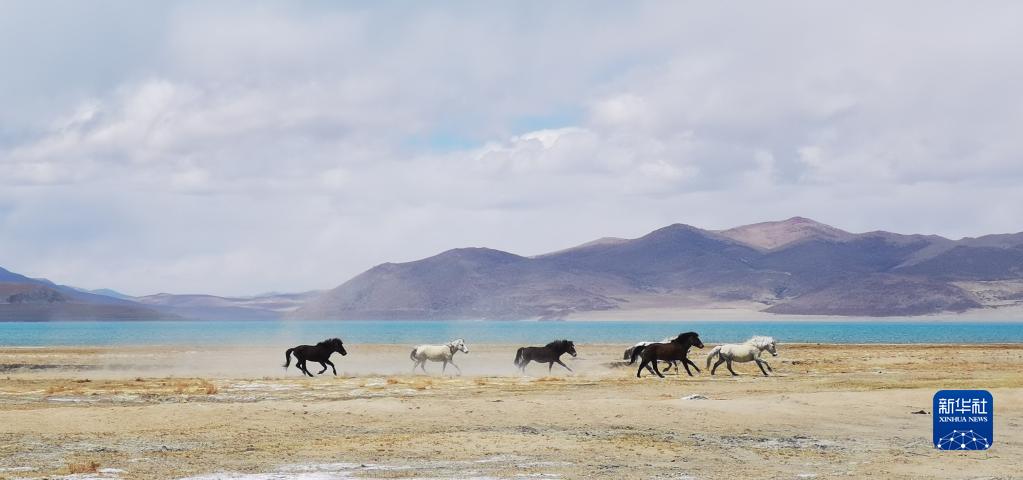 馬群在位于西藏自治區(qū)日喀則市聶拉木縣境內的佩枯錯旁奔跑(2021年5月14日攝,手機照片)。新華社記者 沈虹冰 攝