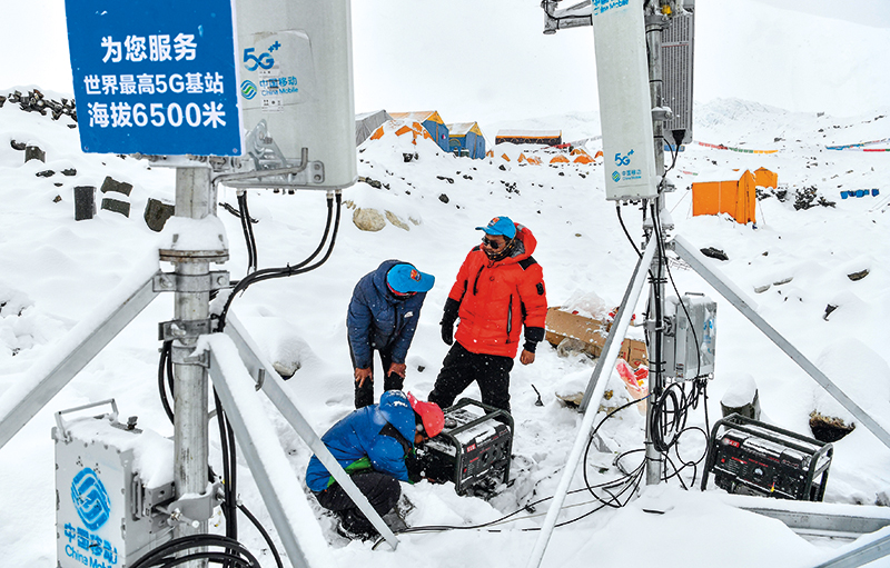 在海拔 6500 米的珠峰前進營地,中國移動工作人員在調(diào)試 5G 基站(2020 年 5 月 21 日攝) 晉美多吉 攝
