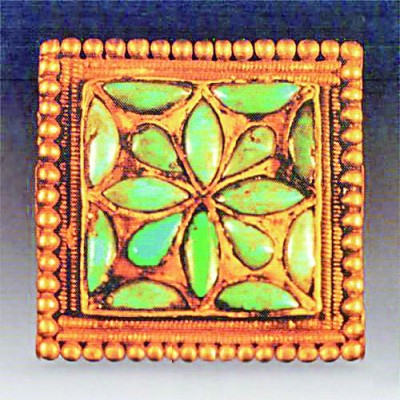 烏蘭泉溝吐蕃壁畫墓暗格木箱內(nèi)鎏金王冠和金杯。資料圖片