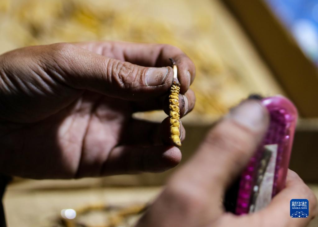 傍晚回到采集點(diǎn)營(yíng)地后,牧民在用毛刷清理蟲草上的土(5月25日攝)。新華社記者 姜帆 攝