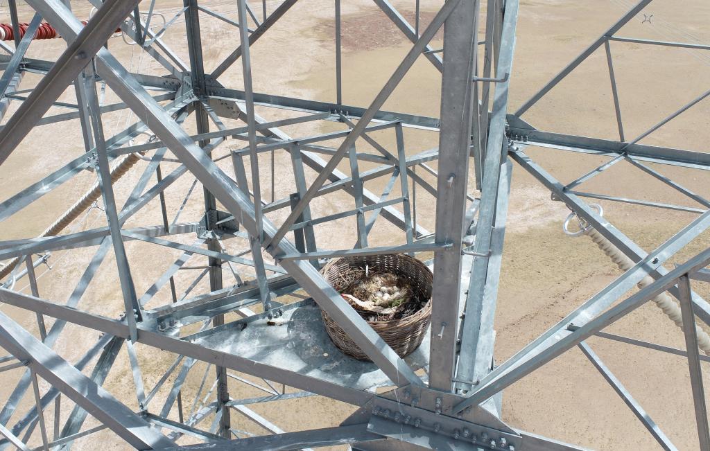 5月19日,國(guó)網(wǎng)青海超高壓公司在±400千伏柴拉直流輸電鐵塔安全區(qū)安裝的“生命鳥巢”中發(fā)現(xiàn)有鳥類筑巢痕跡。(國(guó)網(wǎng)青海超高壓公司供圖)