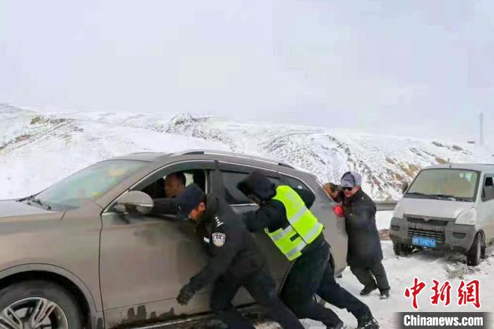 西藏安多交警為受困民眾推車。安多縣公安局交警大隊 供圖