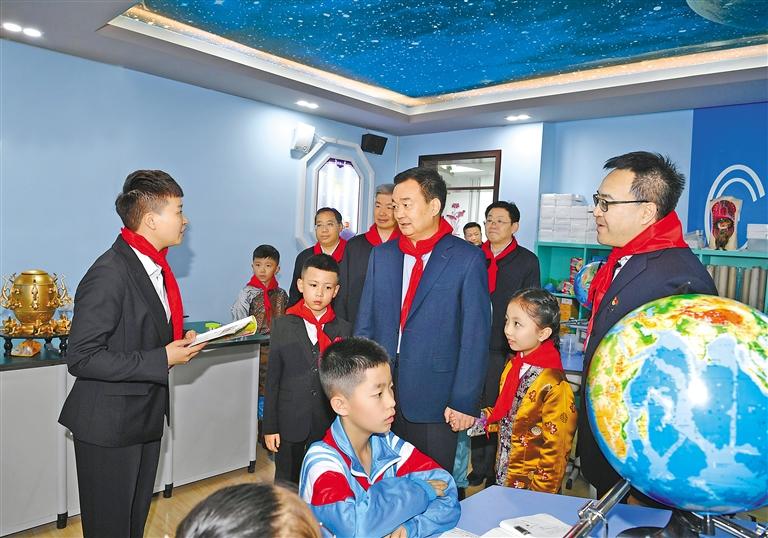 拉薩市第一小學(xué)正在開展的“鑄牢中華民族共同體意識”少先隊活動課豐富多彩。音樂室里孩子們演奏的六弦琴韻律歡快,王君正駐足傾聽,夸贊孩子們多才多藝;科技工作室里老師正引導(dǎo)孩子們做科學(xué)實驗,王君正認真觀看,勉勵孩子們從小樹立科學(xué)觀念,講科學(xué)、愛科學(xué)、學(xué)科學(xué)、用科學(xué),永葆求知探索之心;走進美術(shù)室,看到孩子們埋頭練習(xí),王君正關(guān)切地詢問:“現(xiàn)在孩子們近視的多嗎?”叮囑說,要注意保護孩子們的視力,呵護好他們的身心健康。