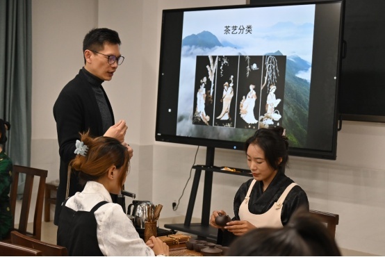 圖為黃淵老師在指導(dǎo)學(xué)生進(jìn)行茶藝實(shí)操。
