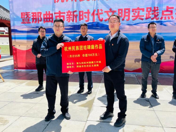 儀式上,那曲市委宣傳部決定將杭州民族團(tuán)結(jié)碑廊設(shè)為那曲市新時(shí)代文明實(shí)踐點(diǎn),并進(jìn)行授牌。杭州援藏工作組向色尼區(qū)捐贈(zèng)價(jià)值700萬(wàn)元的杭州民族團(tuán)結(jié)碑廊書法作品。