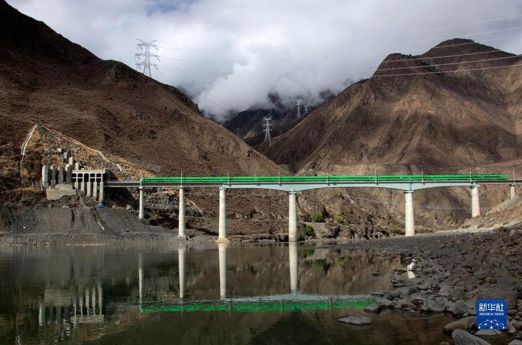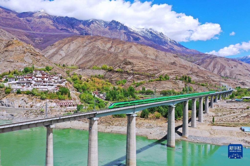 4月14日,復(fù)興號(hào)列車行駛在西藏朗縣境內(nèi)的雅魯藏布江上。新華社記者 覺(jué)果 攝