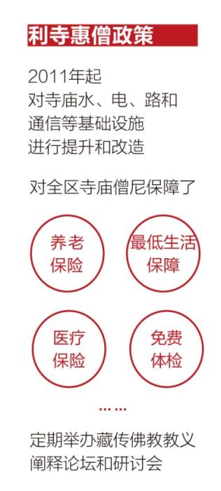 西藏出臺了一系列利寺惠僧政策,對全區(qū)寺廟僧尼保障了養(yǎng)老保險、最低生活保障、醫(yī)療保險、重大疾病醫(yī)療保險、免費體檢等。同時定期舉辦藏傳佛教教義闡釋論壇和研討會,鼓勵藏傳佛教界代表人士對藏傳佛教經典教義作出符合國家法律法規(guī)、社會主義核心價值觀和中華優(yōu)秀傳統(tǒng)文化精神的新闡釋,藏傳佛教中國化邁出了新步伐。