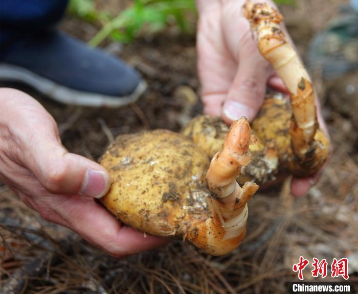 圖為工作人員展示藏天麻種植基地?fù)嵊奶炻?。 冉文?攝