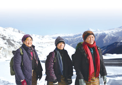 次仁曲珍(左)、普赤(中)、達吉走在前往哨所的路上。 新華社記者 覺 果攝