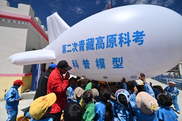 “快看,這個(gè)大白鯨飛起來啦!”,海拔4119米的西藏定日縣扎西宗鄉(xiāng)完全小學(xué)附屬幼兒園里,小朋友們看到緩緩起飛的浮空艇模型興奮地喊著。7月13日上午,中科院珠峰站觀測主管席振華用浮空艇模型、科學(xué)小實(shí)驗(yàn),在這所“珠峰之鄉(xiāng)”幼兒園的新操場上為孩子們上了一堂生動(dòng)有趣的戶外科普課。