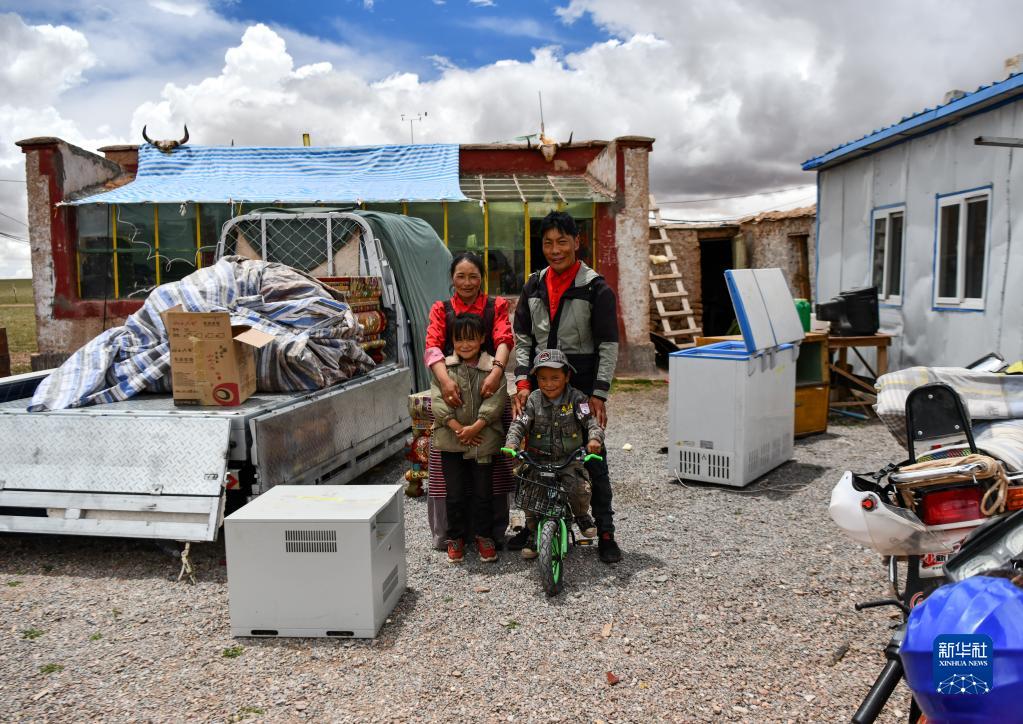 雙湖縣多瑪鄉(xiāng)果根擦曲村牧民貢覺(jué)多吉(中)和父母在老房子前合影。他們搬運(yùn)的家具不多,準(zhǔn)備在新家添置新家具(7月12日攝)。新華社記者 周荻瀟 攝