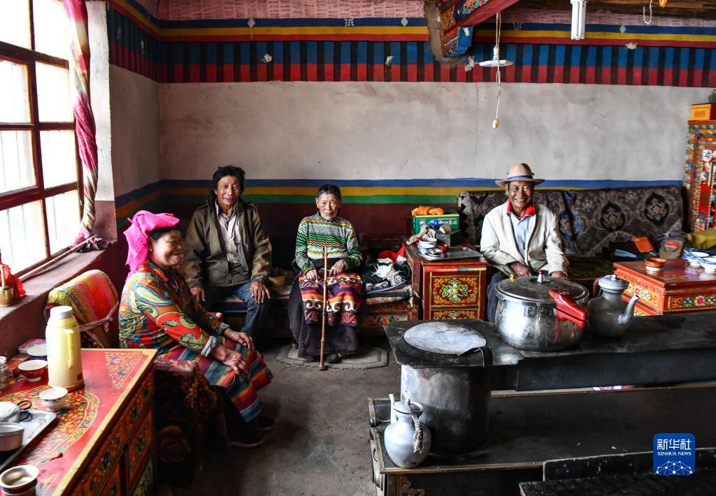 貢覺(jué)(右一)一家人在雙湖縣多瑪鄉(xiāng)果根擦曲村的家中(7月12日攝)。新華社記者 晉美多吉 攝