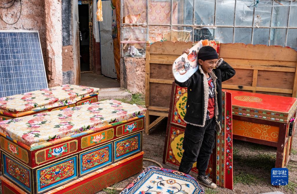雙湖縣多瑪鄉(xiāng)仲魯瑪村的孩子拿著自己心愛(ài)的滑板。雖然滑板的輪子已經(jīng)掉了,他還是想帶到新家去(7月13日攝)。新華社記者 孫非 攝