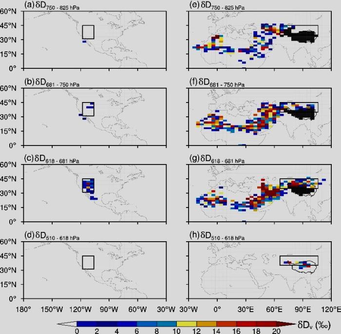 目前,不同地表介質中穩(wěn)定同位素出現(xiàn)“反高程效應”的原因仍然不明。對此,中外合作研究團隊發(fā)現(xiàn),在美國西部和亞洲干旱區(qū)(從紅海到青藏高原北部)等地區(qū)對流層中層的水汽穩(wěn)定同位素也類似存在“反高程效應”,而且其空間分布格局與地表介質中穩(wěn)定同位素“反高程效應”的空間分布格局基本一致。