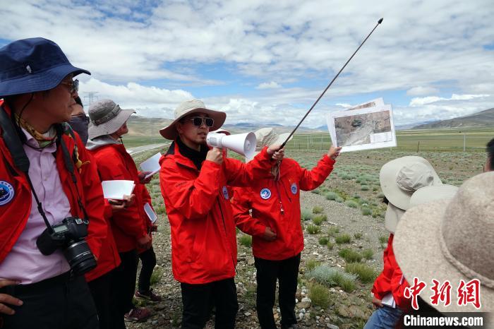 科考隊員、中國科學(xué)院青藏高原研究所張帥博士在古湖底分析講解瑪不錯和嘎拉錯劇變之謎。中新社記者 孫自法 攝