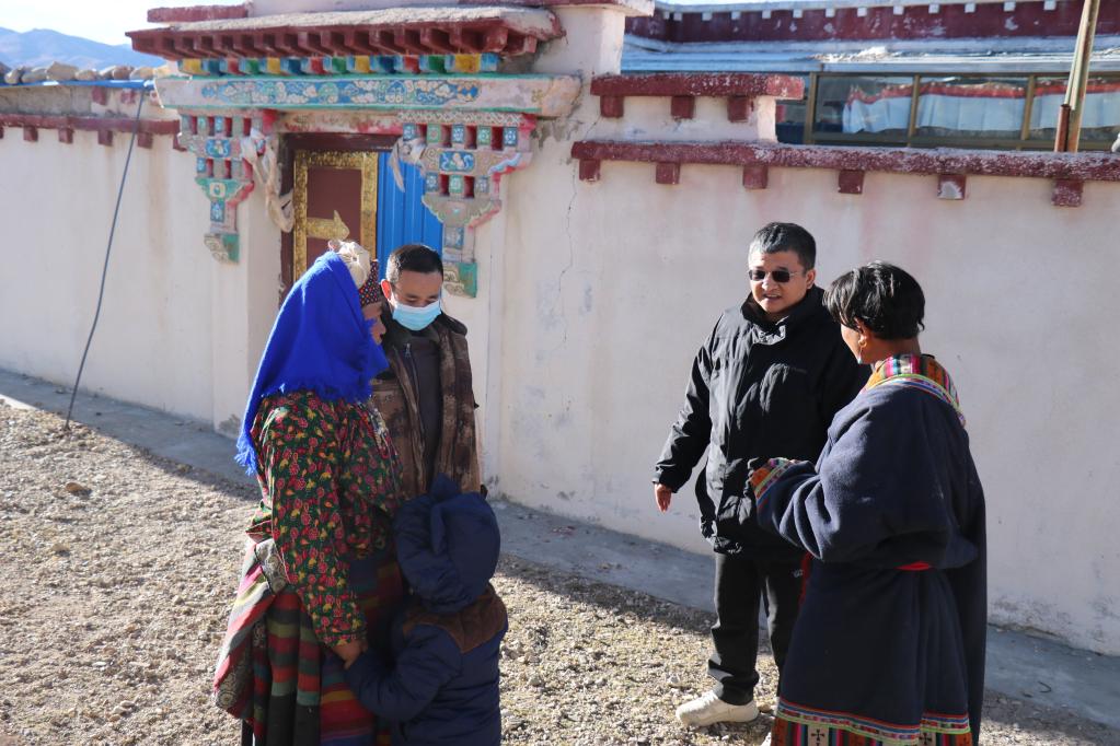 王軍強(右二)在申扎縣巴扎鄉(xiāng)結(jié)對幫扶戶達吉家中了解生活情況。(圖片由申扎縣委宣傳部提供)