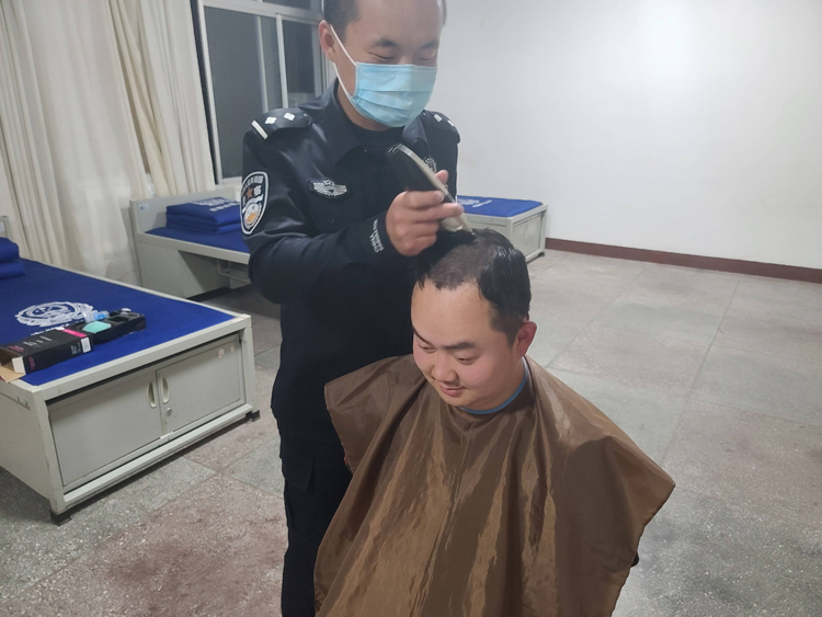 在隔離酒店執(zhí)勤的副所長王士博,在完成工作后請同事幫忙給自己剃了個光頭,“當(dāng)前疫情防控形勢嚴(yán)峻,天氣逐漸變暖,每天穿著防護(hù)服工作,一身都是汗?!蓖跏坎┱f,剃掉頭發(fā)后更加涼快,在節(jié)省時間的同時也能避免頭發(fā)沾染病毒,更加安全。