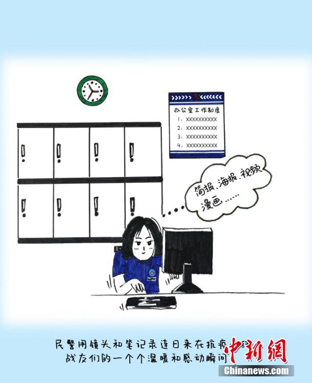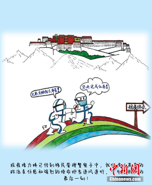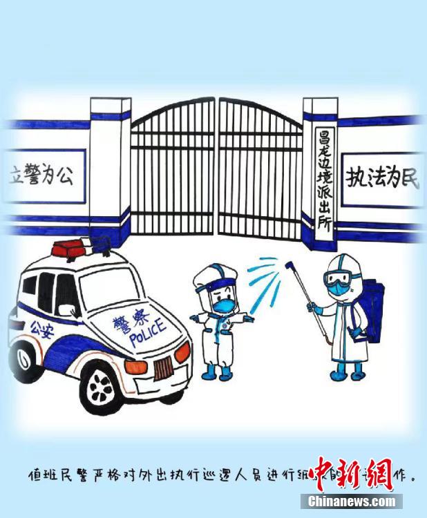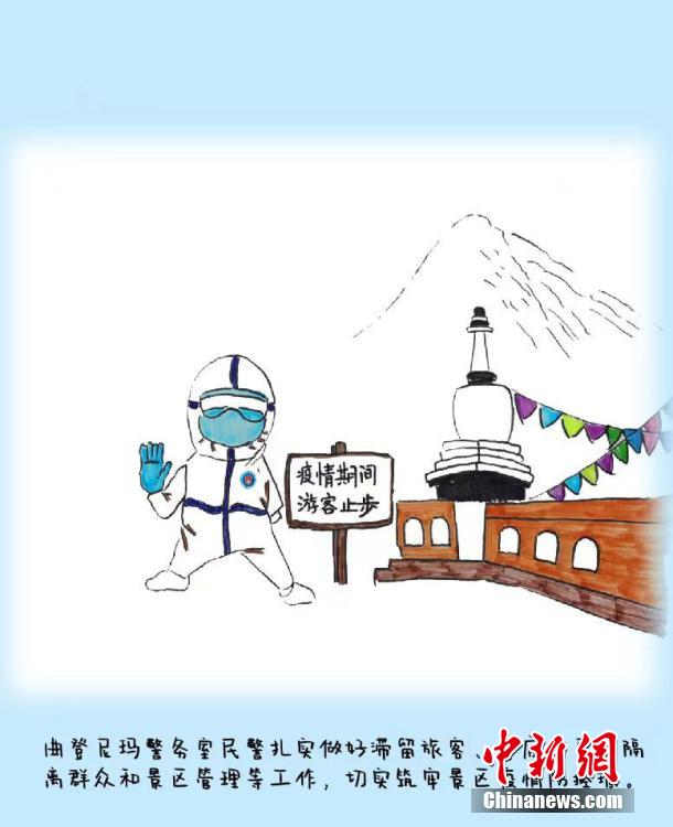 來(lái)自四川省宜賓學(xué)院的沈文靜是西藏日喀則邊境管理支隊(duì)昌龍邊境派出所教導(dǎo)員胡浩的妻子,7月26日來(lái)隊(duì)探親,此后遭遇西藏疫情暴發(fā)。在派出所抗疫期間,沈文靜拿起畫(huà)筆,將奮戰(zhàn)在抗疫一線(xiàn)的移民管理警察身影描繪記錄下來(lái),用漫畫(huà)的方式生動(dòng)再現(xiàn)西藏移民管理警察的戰(zhàn)“疫”人物群像。沈文靜 繪 龍小鳳 文