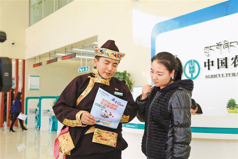 農行西藏分行員工輔導客戶使用掌上銀行辦理業(yè)務。