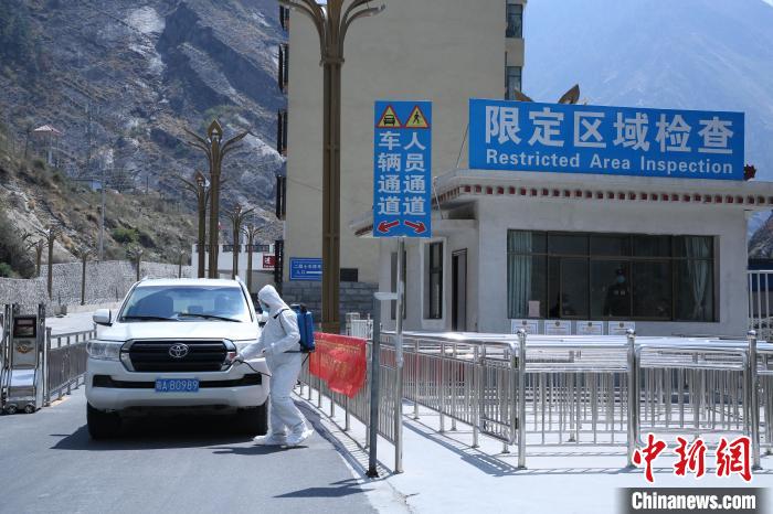 吉隆出入境邊防檢查站移民管理警察對(duì)外出口岸限定區(qū)域車輛進(jìn)行消毒。 肖富貴 攝