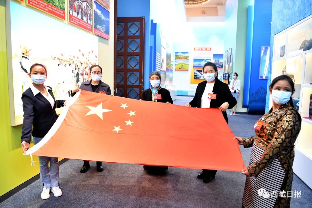 在西藏展區(qū),來自邊境縣的五名基層黨代表共同展示“國旗老阿媽”留下來的國旗。記者 旦增西旦 攝