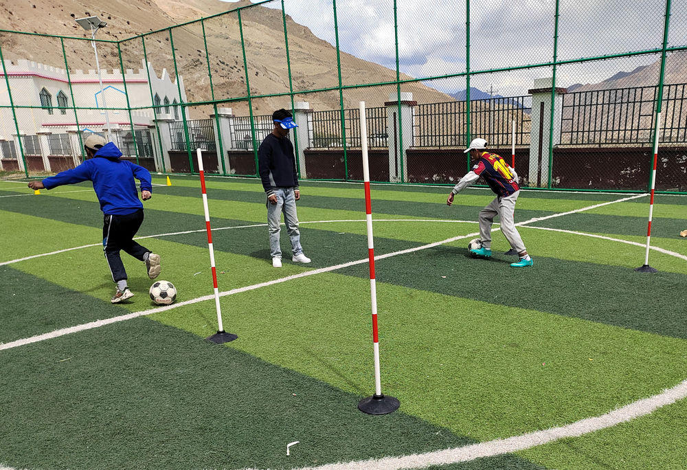 在西藏日喀則市定日縣扎西宗鄉(xiāng)完全小學的球場上,足球興趣小組的教練普次(中)在指導學生帶球繞桿(4月21日攝)。新華社發(fā)(白瑪 攝)