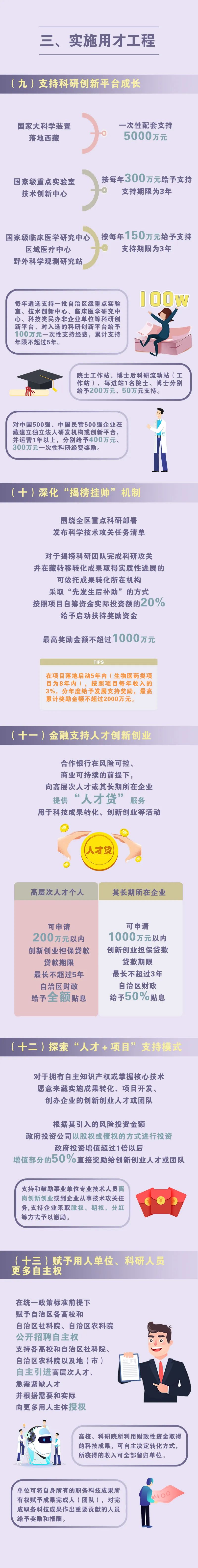 支持科研創(chuàng)新平臺成長,對重點實驗室、技術(shù)創(chuàng)新中心以及院士工作站、博士后科研流動站(工作站)等給予經(jīng)費支持。深化“揭榜掛帥”機制,對完成科研攻關(guān)并在藏轉(zhuǎn)化成果取得實質(zhì)性進展的,給予啟動扶持獎勵資金、發(fā)展支持獎勵資金。向高層次人才或其長期所在企業(yè)提供“人才貸”服務(wù),自治區(qū)財政予以貼息。鼓勵創(chuàng)新創(chuàng)業(yè)人才或團隊來藏實施成果轉(zhuǎn)化、項目開發(fā)、創(chuàng)辦企業(yè),政府投資公司參與創(chuàng)新創(chuàng)業(yè)項目,政府投資增值的部分收益可直接用于獎勵。在統(tǒng)一政策標(biāo)準(zhǔn)、嚴(yán)格執(zhí)行規(guī)定前提下,賦予用人單位、科研人員更多自主權(quán)。