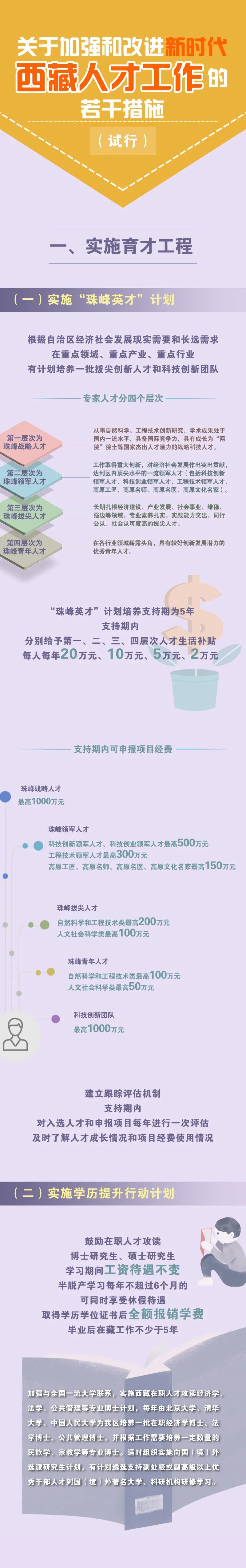 實施“珠峰英才”計劃,每年遴選支持一批珠峰戰(zhàn)略人才、珠峰領(lǐng)軍人才、珠峰拔尖人才、珠峰青年人才和科技創(chuàng)新團隊,在5年支持期內(nèi)給予生活補貼和項目經(jīng)費支持,項目經(jīng)費最高可申請1000萬元。實施學(xué)歷提升行動,支持在職人才攻讀研究生,并協(xié)調(diào)全國頂尖高校為西藏定向培養(yǎng)博士研究生。