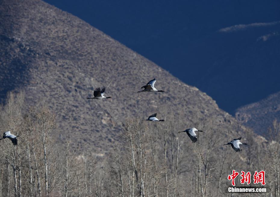 每年的10月底,成群的黑頸鶴飛到西藏拉薩市林周縣越冬,在拉薩市林周縣周邊的湖泊濕地度過5個(gè)月的“閑云野鶴”生活,次年三四月份再飛向藏北草原繁殖。黑頸鶴是世界上唯一一種高原鶴類。具有足長(zhǎng)、喙長(zhǎng)、頸長(zhǎng)的典型涉禽類特征,適合在沼澤地里行走。黑頸鶴的頸、尾為黑色,體羽為灰白色。黑頸鶴是國(guó)家一級(jí)保護(hù)動(dòng)物。目前,每年到林周縣越冬的黑頸鶴已達(dá)2000只左右。圖為黑頸鶴在林周境內(nèi)的農(nóng)田上空飛翔。 貢嘎來松 攝