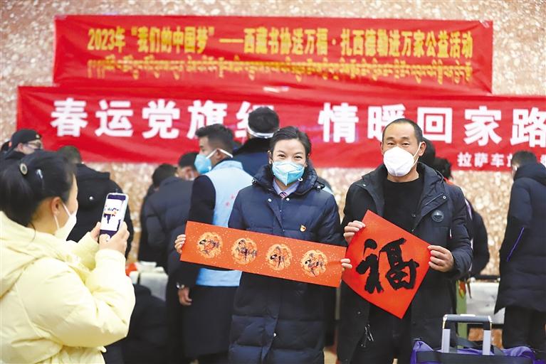 7日,拉薩火車站“天路格?;ā秉h員突擊隊(duì)開(kāi)展兔年大吉心愿墻、新春猜謎送祝福等活動(dòng),提升鐵路運(yùn)輸服務(wù)品質(zhì),讓旅客安心、順心出行。圖為拉薩火車站的工作人員將“?!弊炙徒o旅客。記者 楊小娟 旦增蘭澤 攝